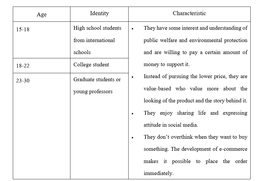 There may be many different segment markets for Ocean Sole. As our team are composed of students and fans of China House are mostly the young generation, we focus on the people with age from 15 to 30 as our target customers, and detailed information are listed as follows.