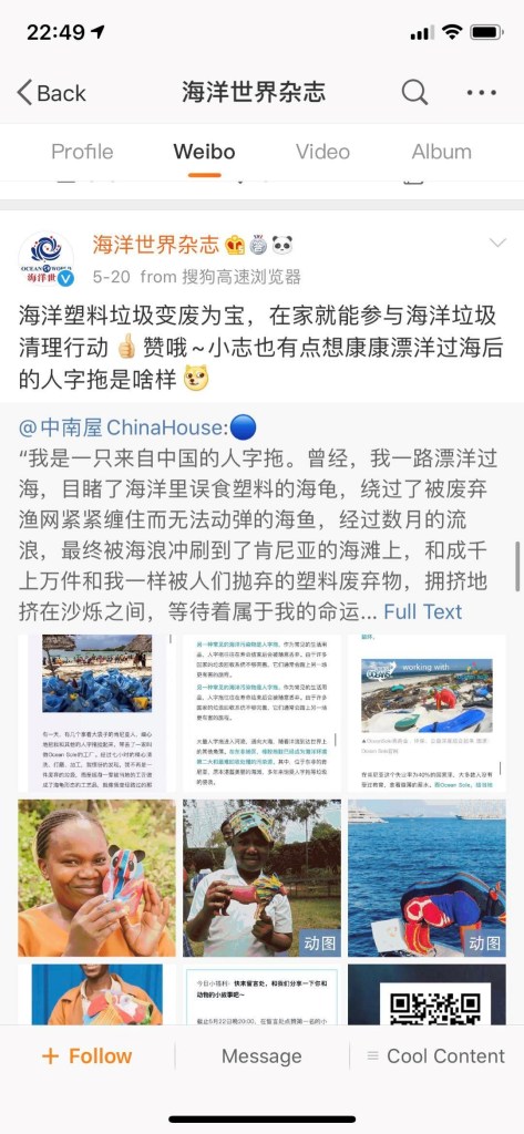Cooperation with NGO & Media —— Ocean Sole can work with NGOs which care about environmental protection. The collaboration way can be advertising on their official social media platform, such as Weibo, Wechat platform. In this event, China Development Brief (16,889 fans) and Magazine “Ocean World”(around 176,000 fans) reposted the article that we posted, which have attracted more attention. Some potential partners are willing to repost Ocean Sole’s products: