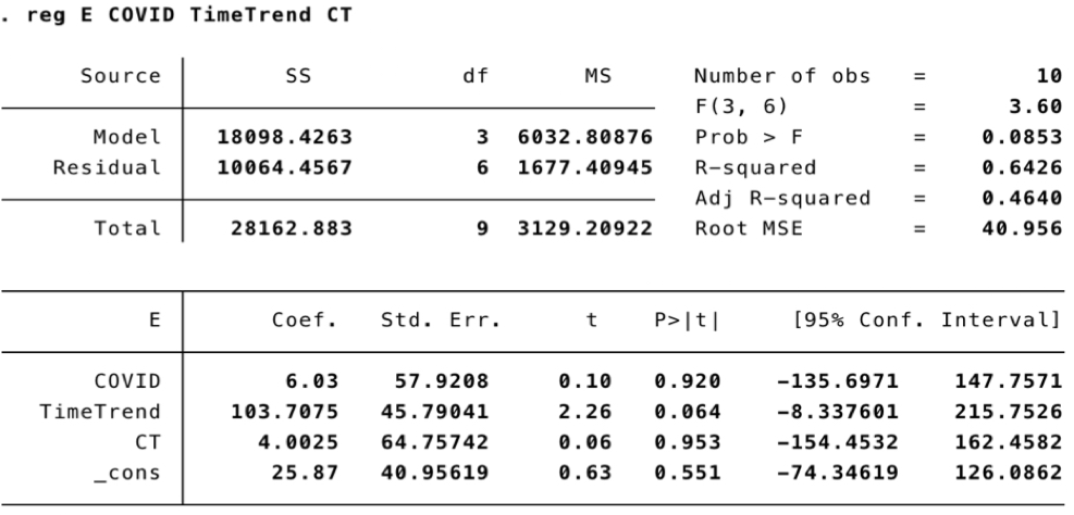 E = 25.87 + 6.03COVID + 103.71TimeTrend + 4.00CT + ei