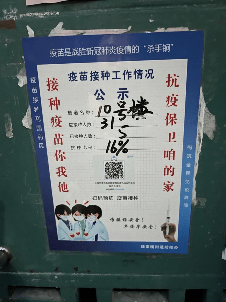 In China, besides the ubiquitous propaganda, the government and some organizations will send people text messages, emails, and even stick posters on the front doors of their compound. Zhao, who now lives in Shanghai, found a poster about vaccines posted at the entrance of her residence. On this poster, it says: The vaccination rate of our unit is only 16%. Additionally, this kind of poster is on the enter-gate of every building, thus creating a “competition of vaccination rates” between residents of buildings. Zhao said because of the relatively low rate of vaccination of her building, which makes some residents feel the “shame” of not getting vaccinated. In other words, she feels this poster is one way of public shaming for those who have not been vaccinated. By feeling so, there will be more people to take the vaccine shot.