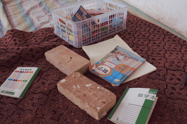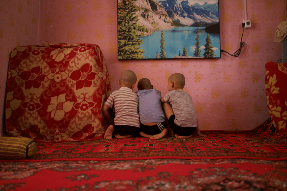 A nine-year-old child with cerebral palsy (middle) in a village of Boshikeranmuxiang, whose medical costs take up half of his family’s income
