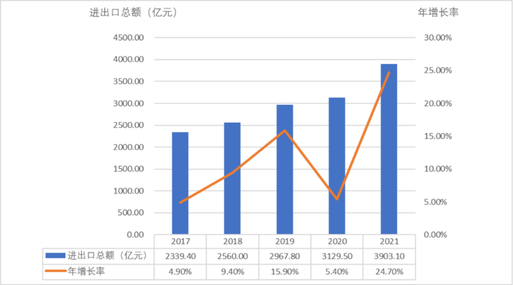 从上面的图表可以看出,整体来说,义乌国际贸易的交易总额呈现上升趋势。虽然交易总额在2020年的年增长率较过去有所下降,但是到了2021年,年增长率又回到甚至超过了疫情前的速度。
