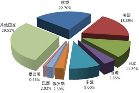 美国是我国服装出口的第三大市场,我国服装位于美国进口服装供应国之首。亚洲是我国服装出口第一大洲,占出口总额的36.68%。我国对非洲、拉丁美洲和大洋洲出口额占出口总额的5.48%、4.56%和2.74%。「10」