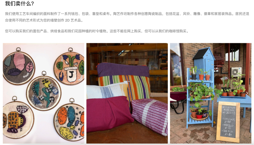 Camphill Milton Keynes容纳了70名利亚姆这样的学习障碍者。在这里,居民可以参与不同类别的工作坊,包括编织、刺绣、烘焙和种植等。社区将居民在工作坊上完成的成果售出,以此维持社区的运转。同时,社区还有一间自营咖啡馆,居民种植和制作的食物也会在这家咖啡厅售出,以获取一定的资金。最后,居民们自己创作的内容也通过播客、文章等方式传播,为社区吸引了许多的支持者。
