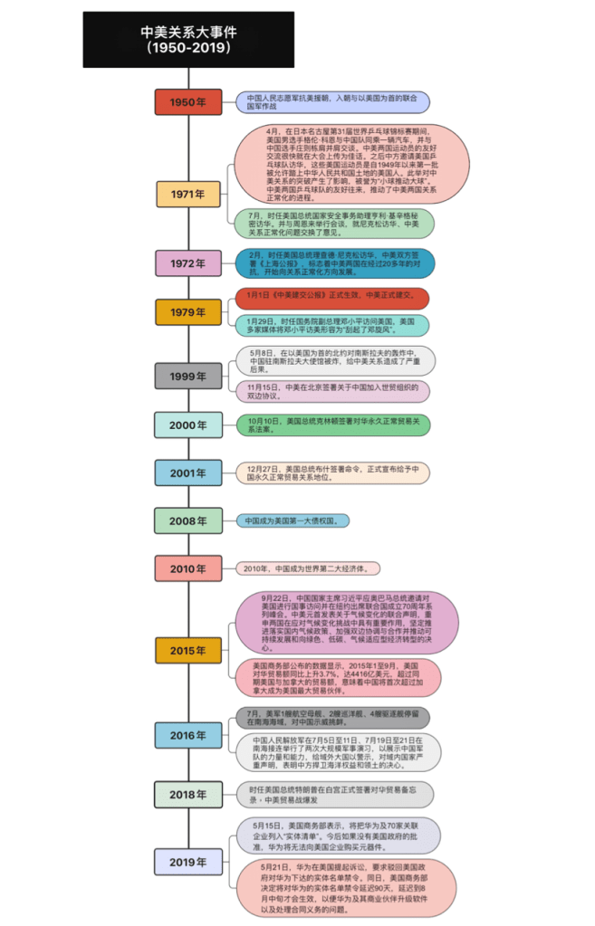 回溯中美两国交往的历史,其中既有冲突也有合作。中美关系的历史大致可以分为僵持期(1949-1970),破冰期(1971-1978),蜜月期(1979-1990),发展期(1991-2015),竞争与合作时期(2016至今)。