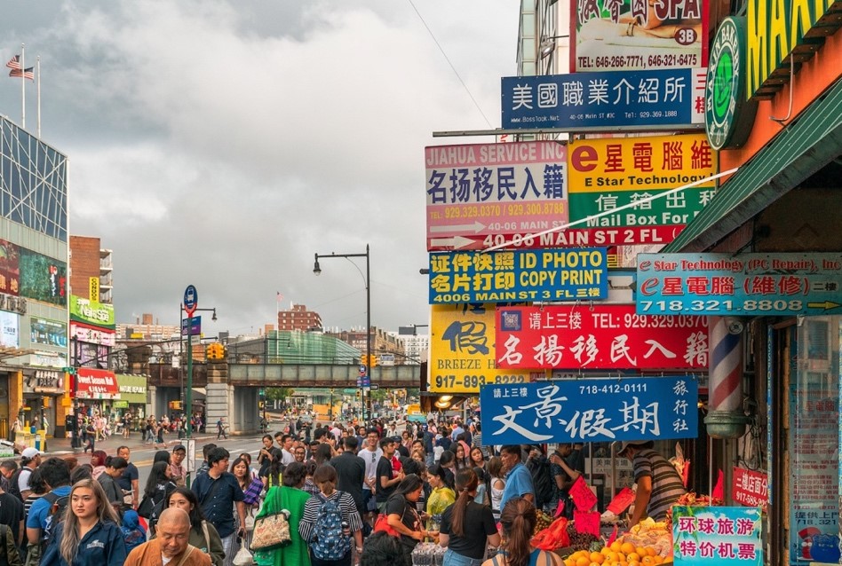 在纽约的多个社区中,皇后区的法拉盛(Flushing)以其密集的亚裔人口而闻名。据最新的人口普查数据显示,法拉盛大约有18万居民,其中66%是亚裔。他们主要来自中国、韩国和巴基斯坦等国。值得注意的是,法拉盛是纽约最大的华人社区。