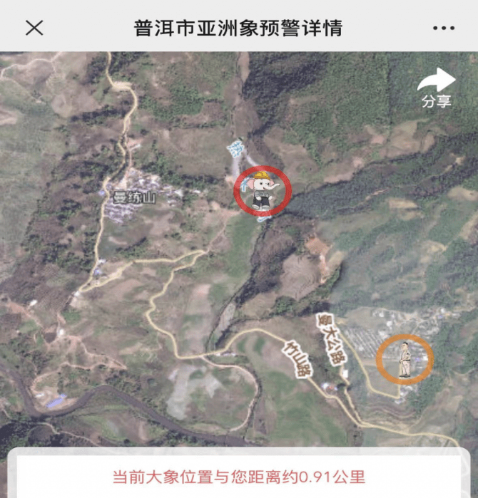 在防象安全方面,村民们也建立了一定的认知。村民们会定期查看手机上的“普洱市亚洲象预警”系统。这个系统由林业和草原局(简称林草局)牵头,监象员发布监测预警信息。监象员会使用无人机监测并上传大象的位置到“普洱市亚洲象预警”的系统中,同时把信息分享到村里的微信群方便村民们查看。