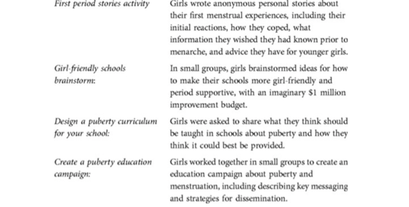 女性的月经羞耻不仅存在于历史方面,这种现象目前也依旧普遍存在。有关研究表明,部分女孩依旧羞于提起关于月经的话题。下表是美国关于月经话题的一项调查。在每个城市,8-10名女孩被聚集在一起进行多次会议,深入研究女孩的经历,包括探讨女孩如何在学校和家里了解青春期和月经的问题。