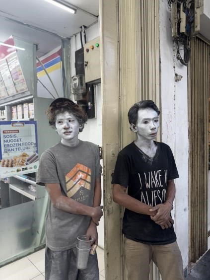 在雅加达的街边我们偶遇了几位街头表演者“小银人”,他们没有任何劳动保障。他们在烈日下涂满银色油漆、站立不动数小时,只为了吸引游客拍照来赚取小费。“每天站八九个小时,赚的钱也只够一顿饭。”一位在雅加达市中心演出的艺人对我们坦言,他的日收入仅有13万~18万印尼盾(60~80元人民币),一旦生病或出事,只能自己硬扛。