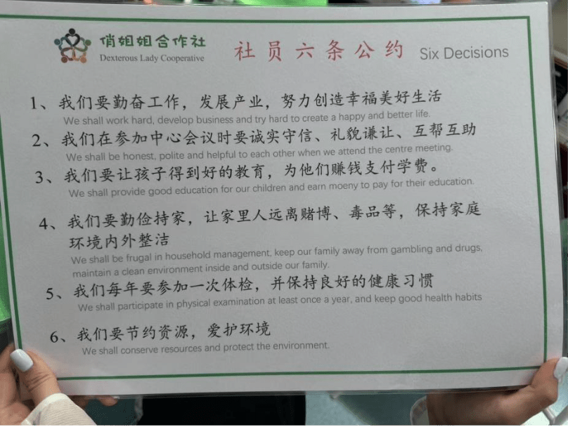 The six decisions encompass all aspects of members’ lives, including their social relationships, families, and education. Specifically, they are: “1. we will work hard, be punctual and follow rules, help each other, and avoid bad habits; 2. we should meet in a safe and comfortable place; 3. we should safeguard our children’s education; 4. we should have regular medical check-ups and pay attention to our health; 5. We should use clean and hygienic toilets and pay attention to hygiene 6. We should conserve resources and protect the environment. “